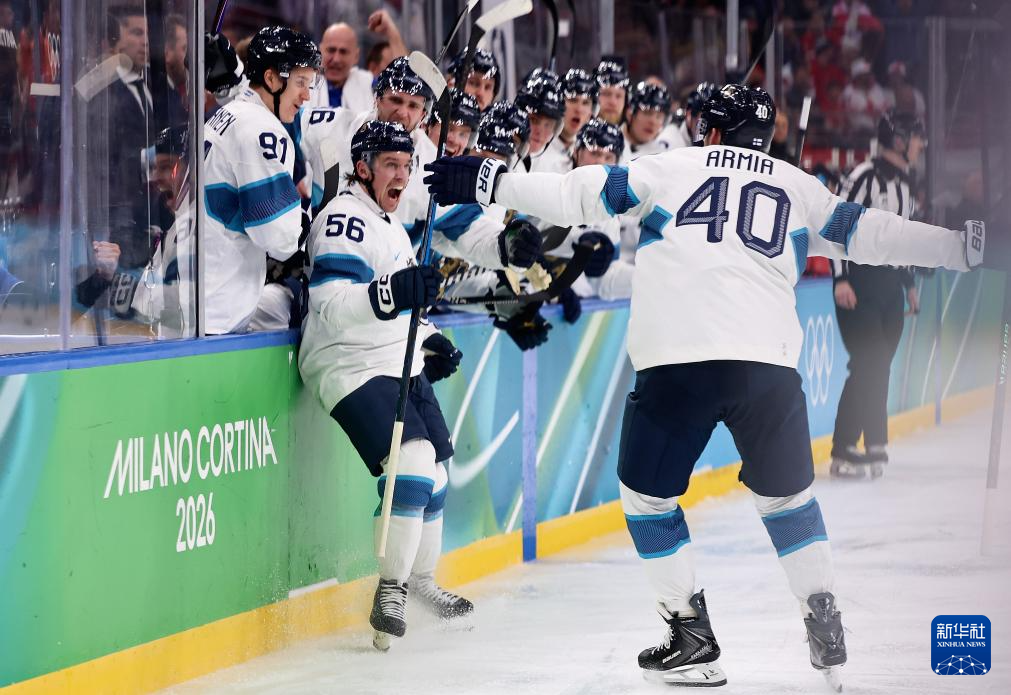 2月20日,芬兰队球员在进球后庆祝。