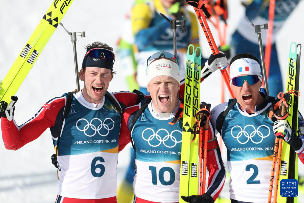 2月20日,亚军挪威选手斯图拉·霍尔姆·莱格雷德、冠军挪威选手约翰内斯·戴尔、季军法国选手康坦·菲永·马耶(从左至右)在终点庆祝。