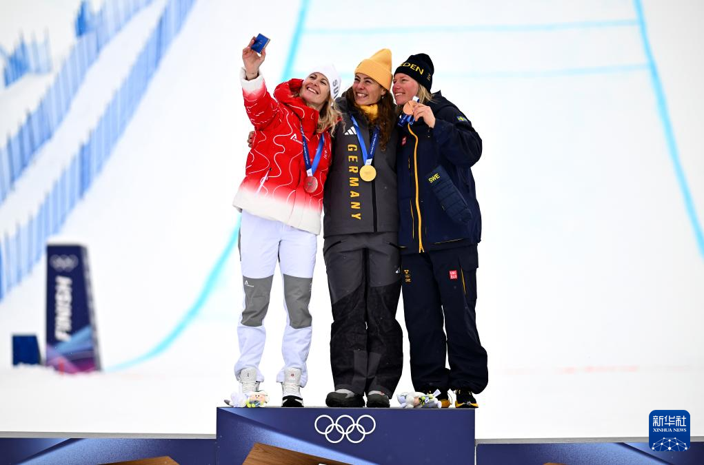 2月20日,冠军德国选手达妮埃拉·迈尔(中)、亚军瑞士选手范妮·史密斯(左)、季军瑞典选手桑德拉·内斯隆德在颁奖仪式上自拍合影。