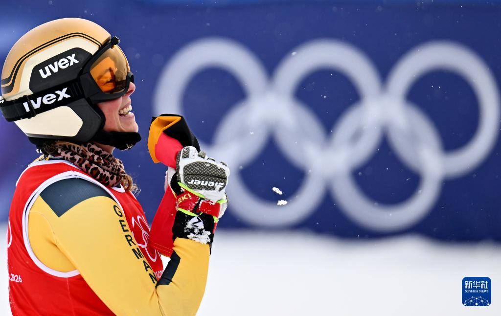 2月20日,德国选手达妮埃拉·迈尔在决赛冲线后庆祝。她获得冠军。