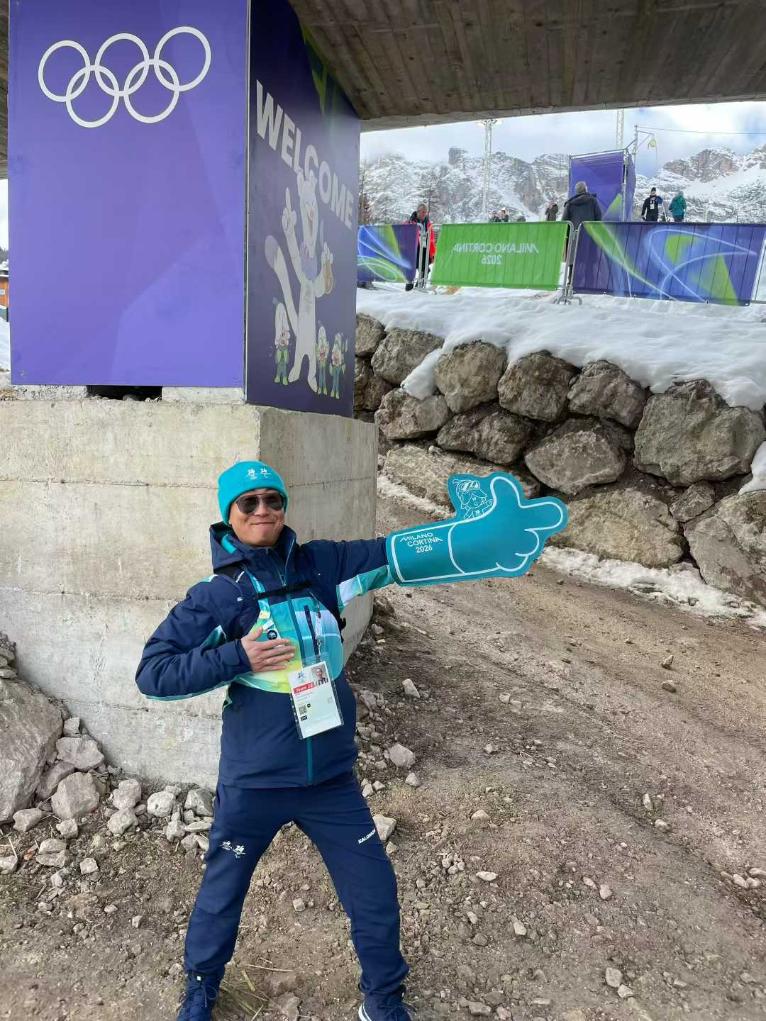 ↑在科尔蒂纳冰壶馆前的引导志愿者钟昕