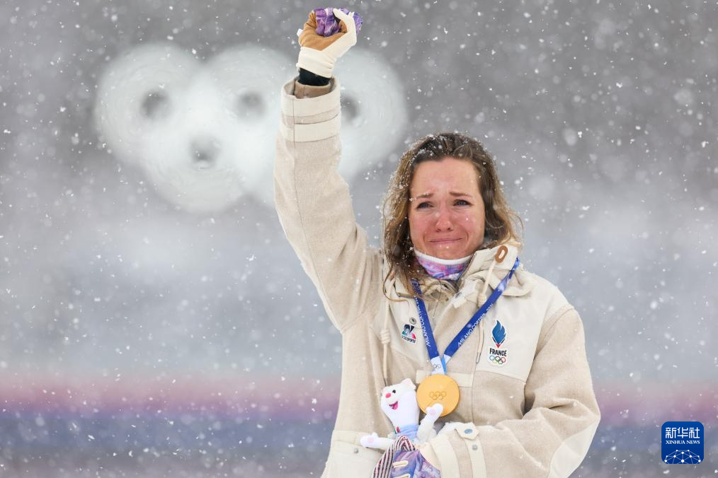 2月21日,冠军法国选手米舍隆在颁奖仪式上落泪。