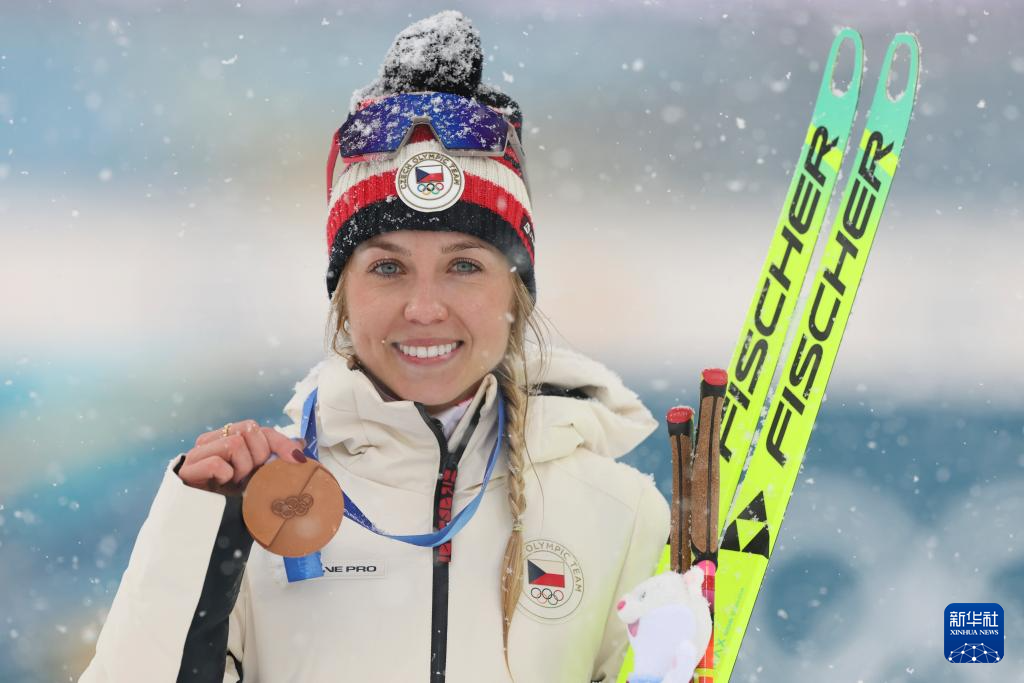 2月21日,季军捷克选手沃博尔尼科娃在颁奖仪式上庆祝。