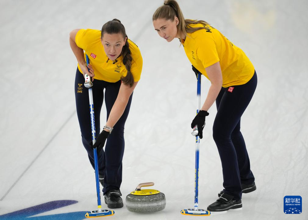 2月22日,瑞典队选手哈塞尔堡(右)在比赛中掷壶。