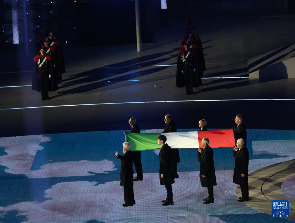 这是2月22日在闭幕式现场拍摄的意大利国旗。