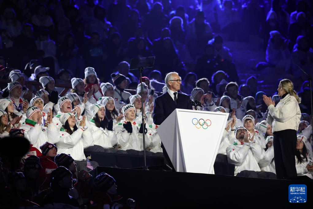 2月22日,米兰-科尔蒂纳冬奥会组委会主席乔瓦尼·马拉戈(前左)在闭幕式上发言。