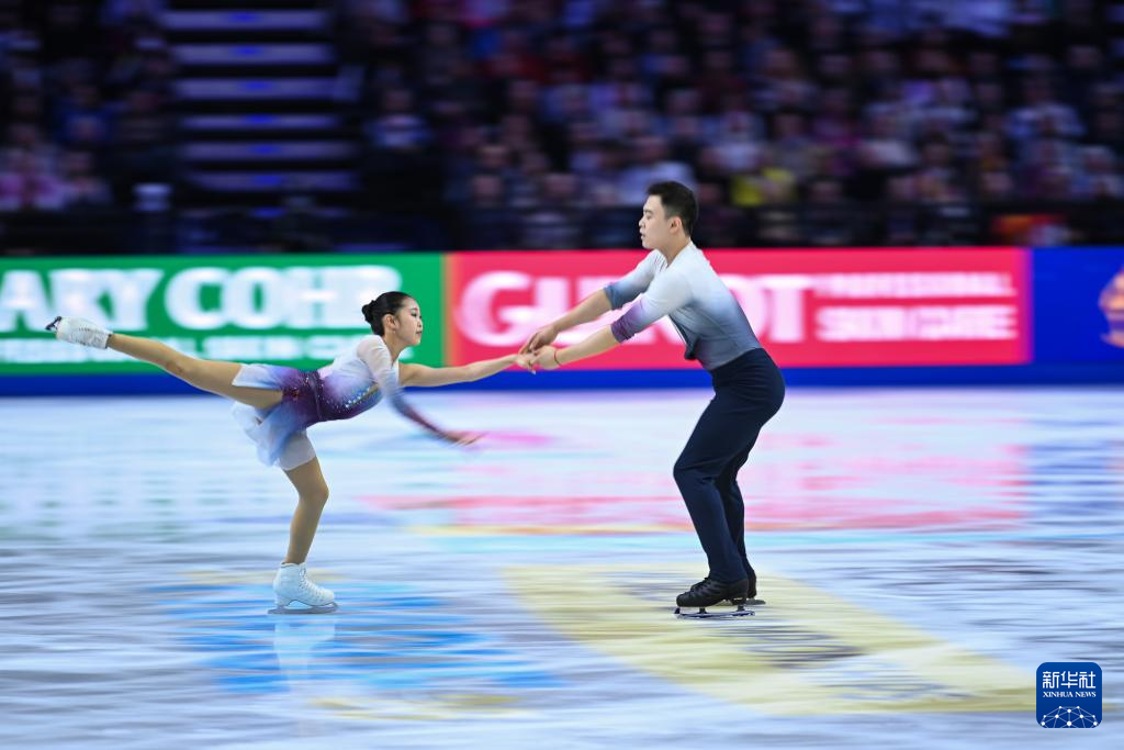 3月26日,中国组合张嘉轩(右)/黄一航在比赛中。最终,他们获得双人滑第九名。