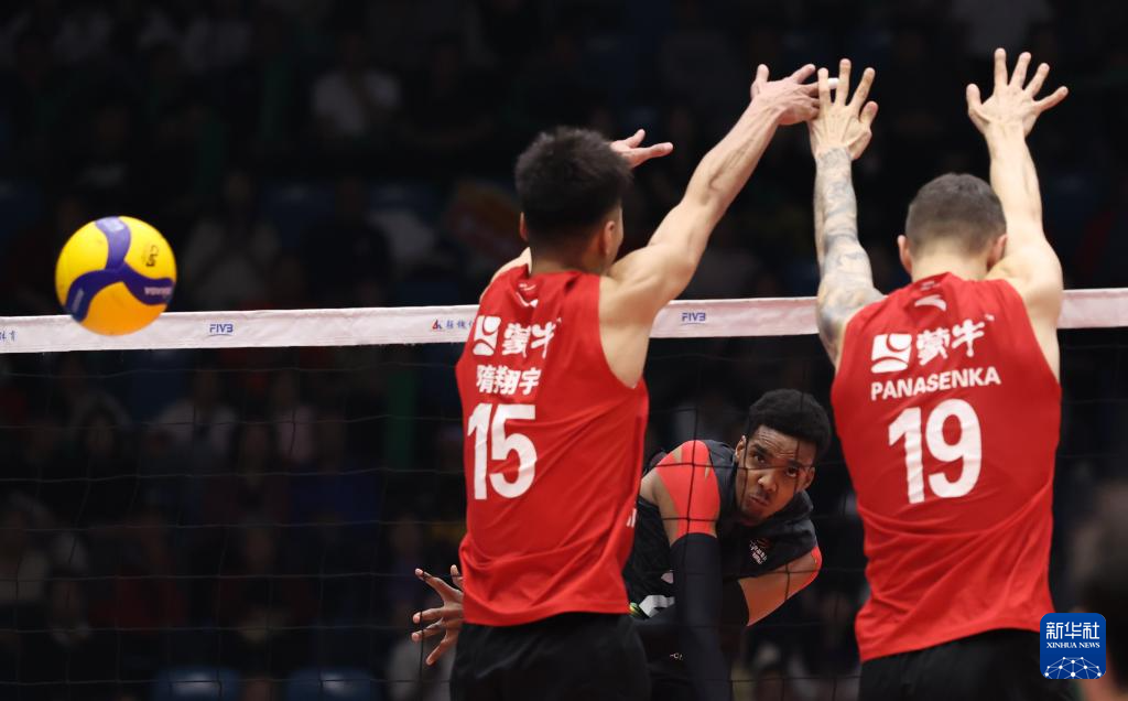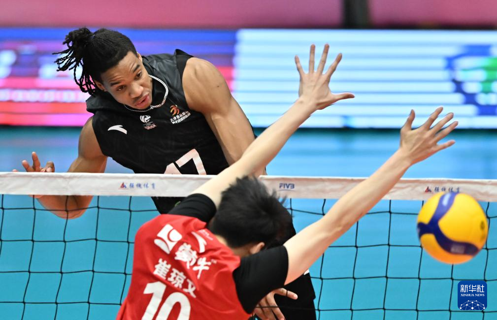 3月29日,天津食品集团队球员菲利克斯(中)在比赛中扣球。
