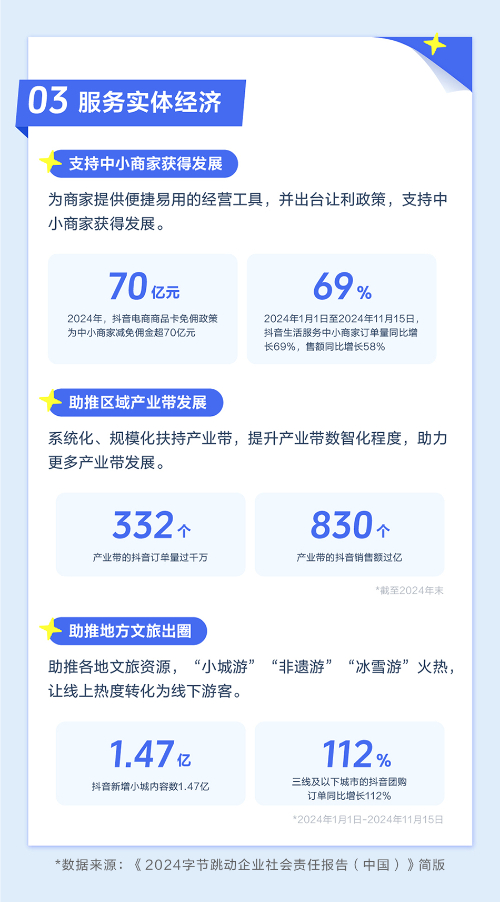 当下,网络直播正为经济增长注入新动能。时代浪潮下,字节跳动发挥平台能力,在创造商业价值的同时践行社会责任。在助力个人就业方面,抖音及相关生态催生了新的就业机会,为大众提供了更多元、灵活的就业选择。2024年7月,生活服务体验员(即探店达人)、网络主播等数字职业已被人力资源和社会保障部等部门共同增设为国家新工种、新职业。在促进乡村振兴方面,字节跳动通过电商、文旅等版块,让好产品和好风光出圈。数据显示,2023年9月至2024年9月,抖音电商累计销售农特产品71亿单;2024年全年,抖音“美好乡村等你来”乡村旅游数字提升行动带来游客2265万人次。在服务实体经济方面,字节跳动通过数字工具支持和让利政策,助力中小商家在抖音电商打开生意新局面。数据显示,过去一年,共有830个产业带在抖音销售额过亿。