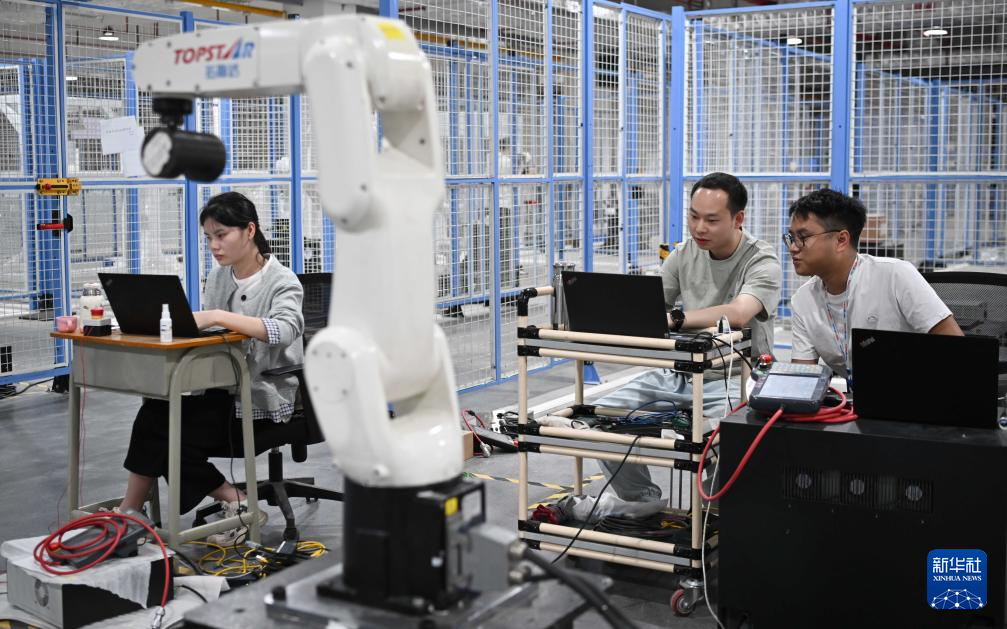 2025年3月25日,在东莞的广东拓斯达大岭山生产基地,工作人员在测试工业机器人产品。