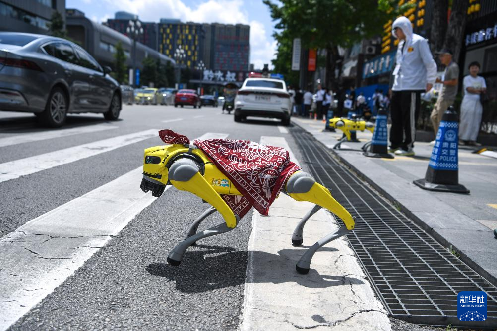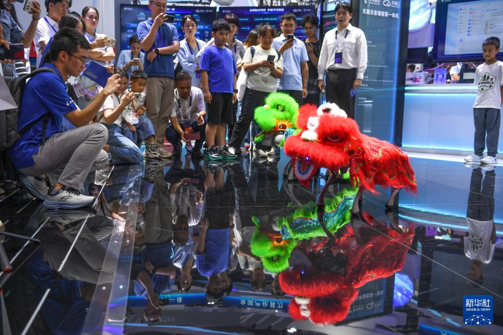8月28日,中国电信在数博会上展出的一款机器狗在进行舞狮表演。