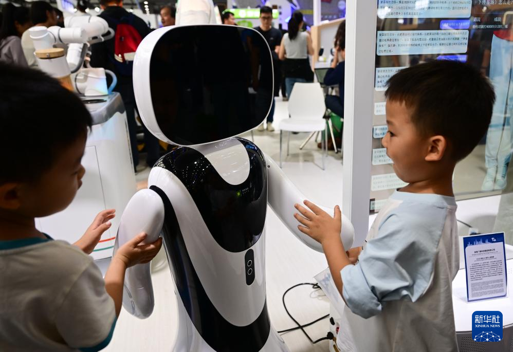 9月20日,小朋友在2025世界制造业大会智能机器人展区和一款机器人互动。