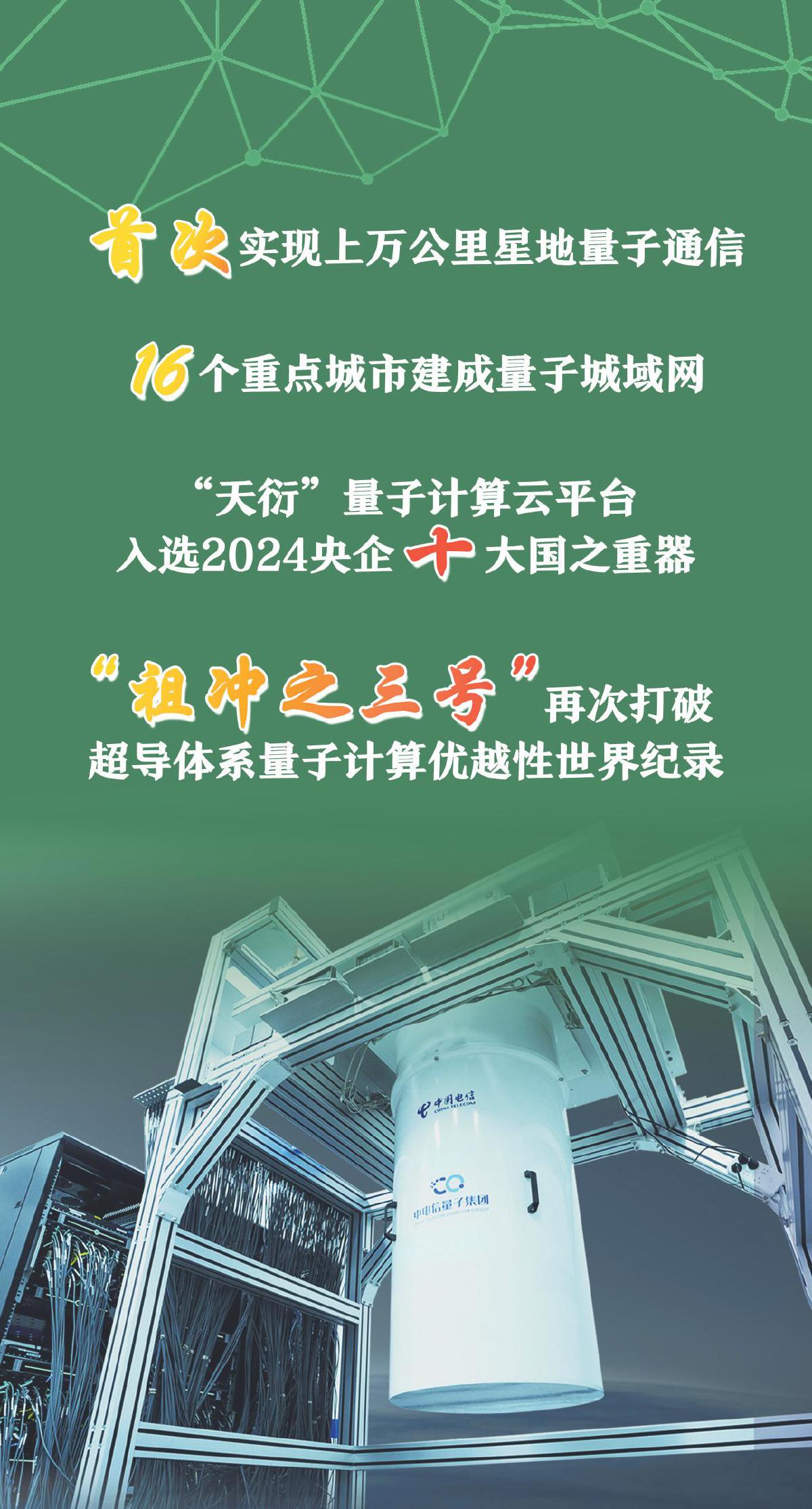 在量子计算领域,目前,中国是世界上唯一在超导量子和光量子两种物理体系上都实现“量子计算优越性”的国家。2023年11月,中国电信发布“天衍”量子计算云平台,成为全球首个具备量子优越性能力的超量融合云平台,迄今吸引了60多个国家的用户,并入选2024年度央企十大国之重器。2025年3月,中国科学技术大学团队成功构建105比特超导量子计算机“祖冲之三号”,再次打破超导体系量子计算优越性世界纪录。