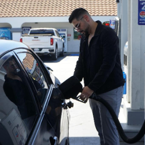 3月17日,顾客在美国加利福尼亚州洛杉矶县埃尔蒙特市的一家加油站给车辆加油。新华社发(曾慧摄)