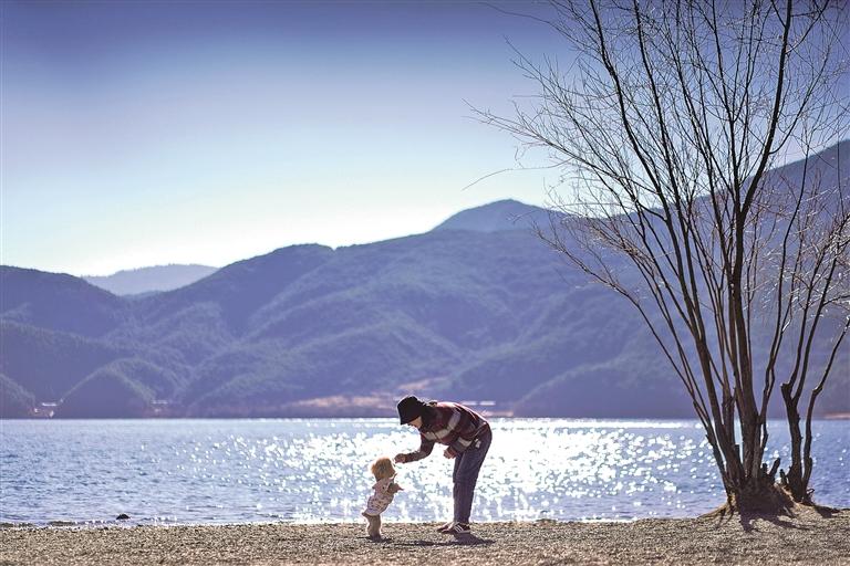 游客与宠物在四川凉山泸沽湖景区拍照留念。新华社发